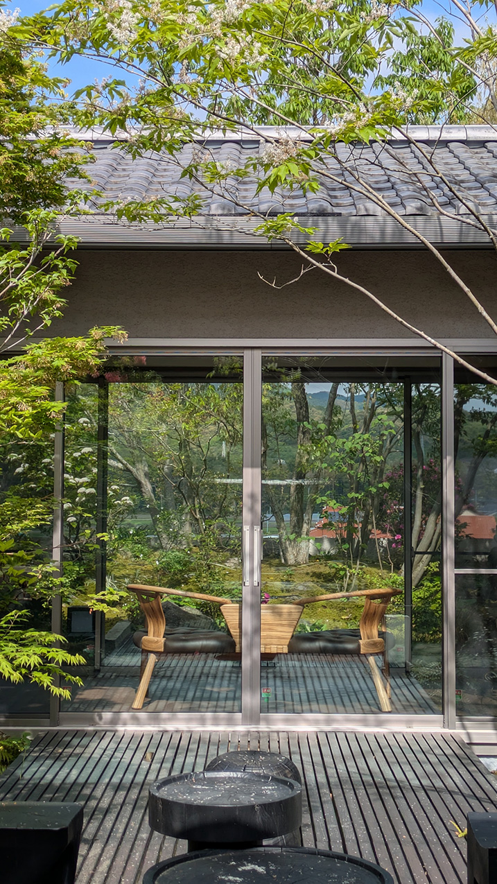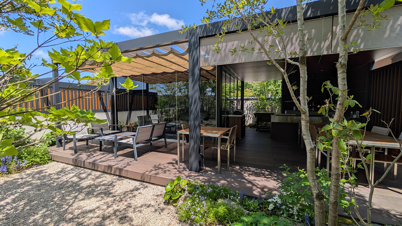 庭をみながら滝の水音を聞きながら、BBQや食事ができるスペースとして、