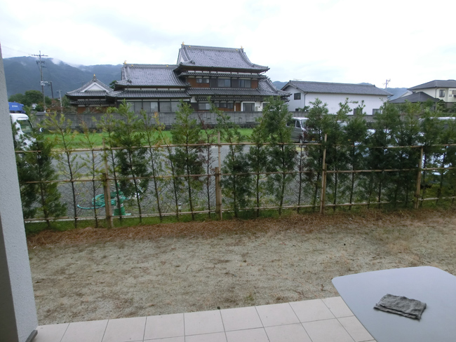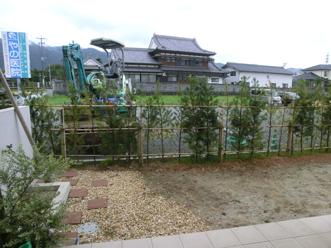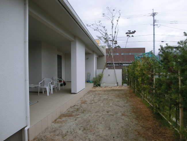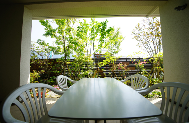 大きく設けたタイルテラスからの眺望はマキの生垣だけではあまりにもったいない。