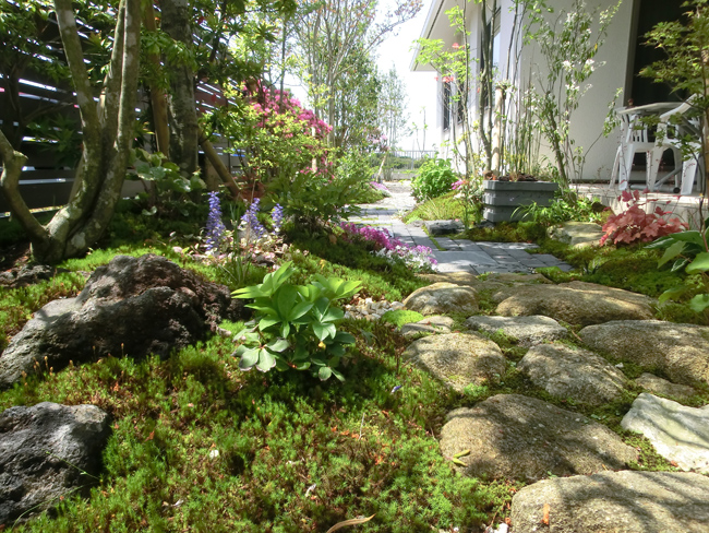 あしもとは苔と石でシンプルにまとめつつも、随所に季節の花が咲く下草や低木を植え込んでいます。