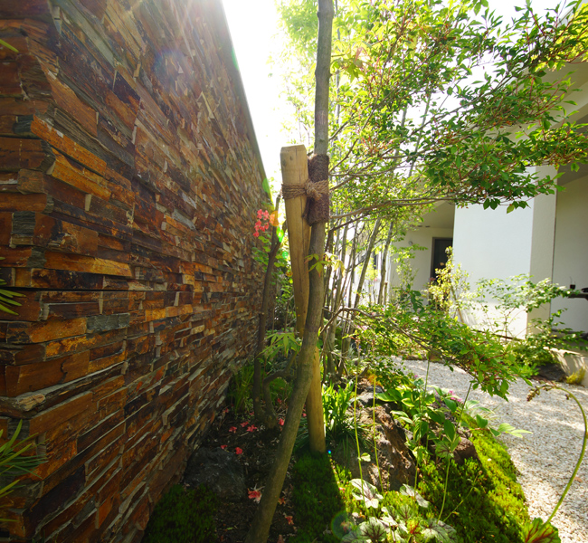間延びした庭にならない様、アクセントとなる壁や板塀で背景を造り出し、ゾーンごとに景色を変えつつ、