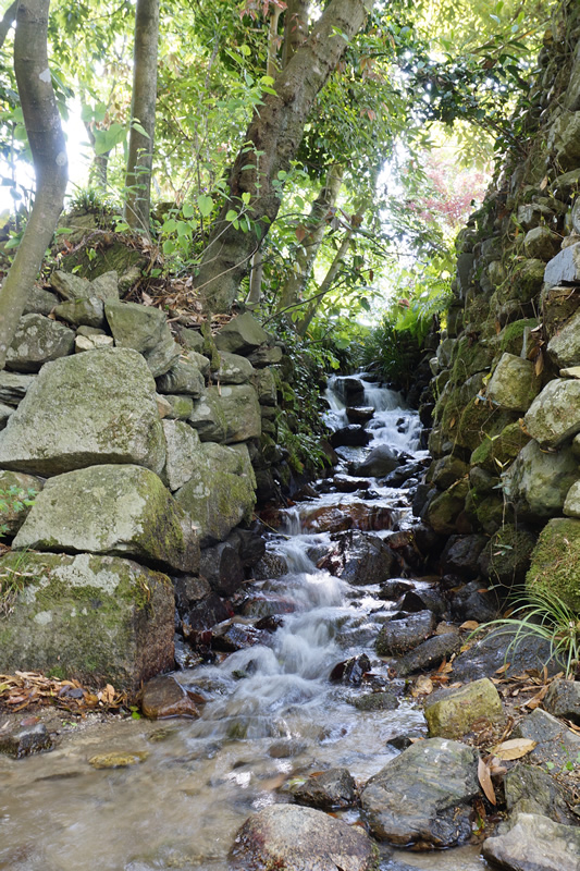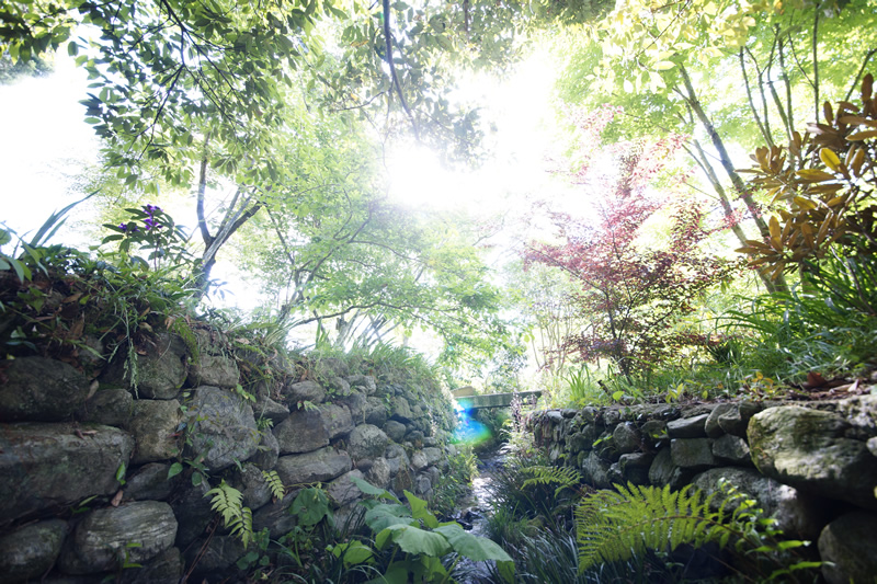 山音ガーデンの奥に流れる小川。先人たちの築いた石積みが歴史を感じさせます。