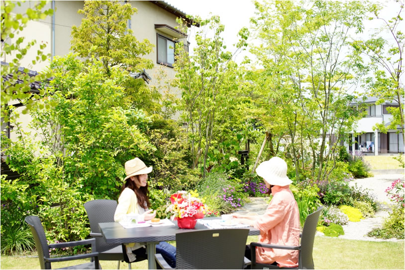 青々とした芝生にテーブルセットを置いて、風を感じながらお茶を楽しめる贅沢な空間になりました。