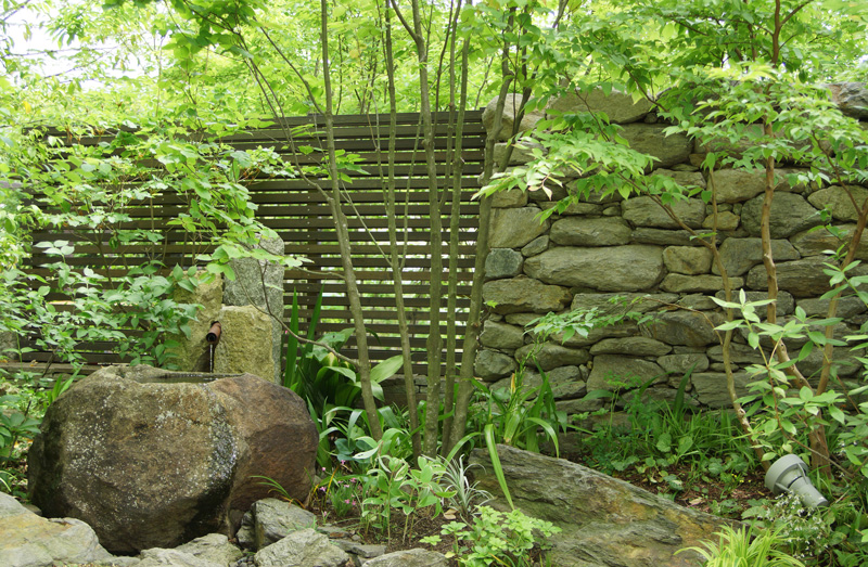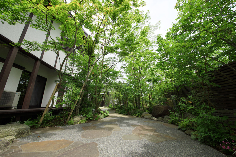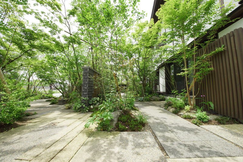 適度に視線を遮りながらも、幹越しに奥へ奥へと視線が抜けていくように木々を配置し、