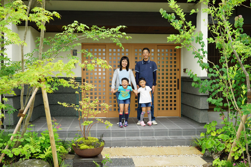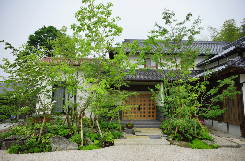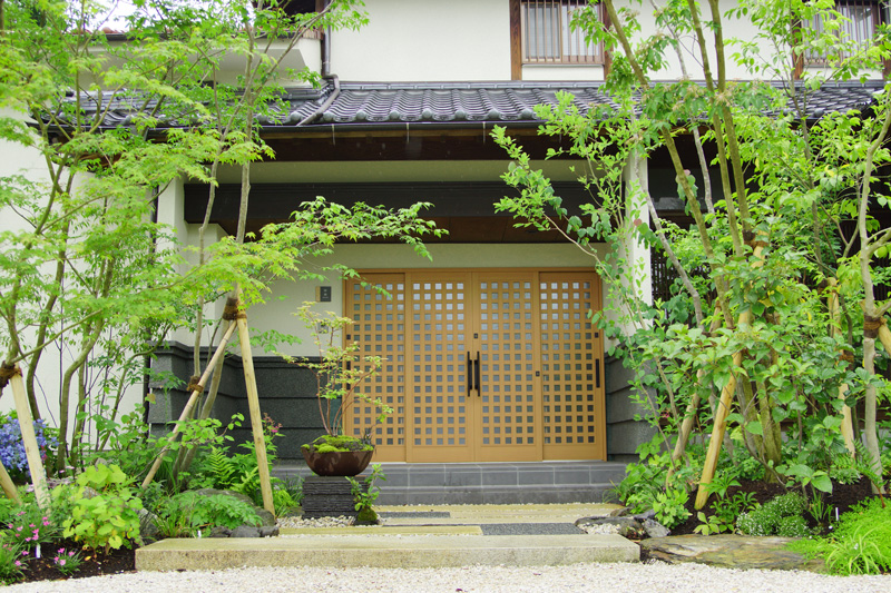 雑木と草花に包まれた日本家屋の玄関アプローチ全景