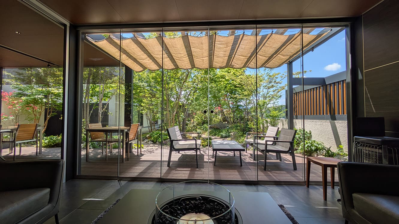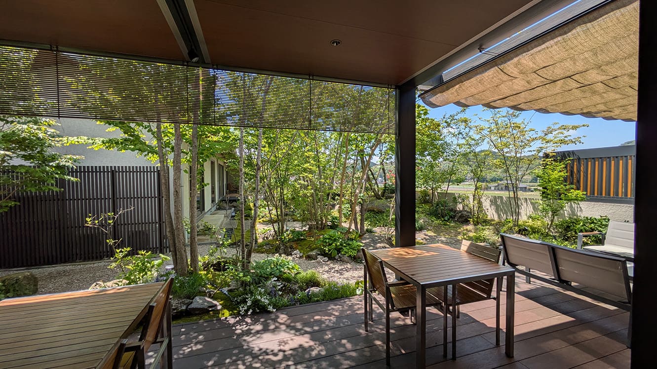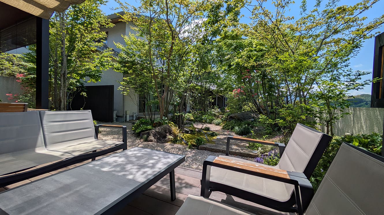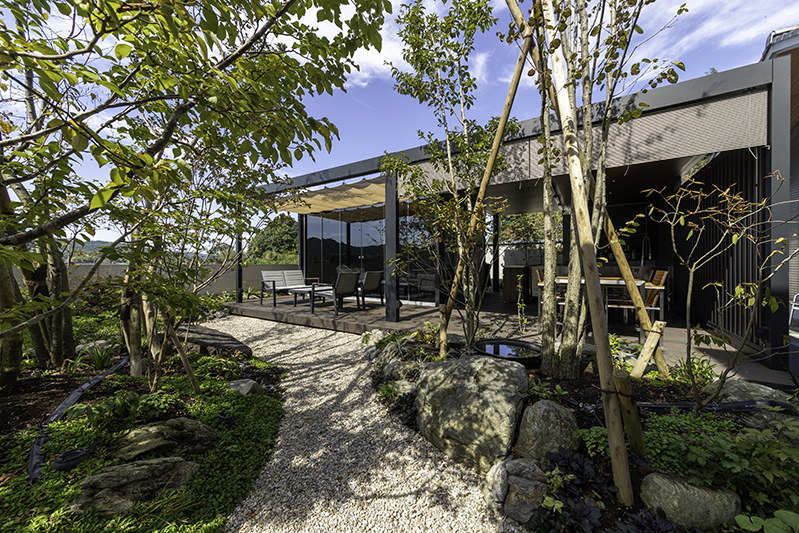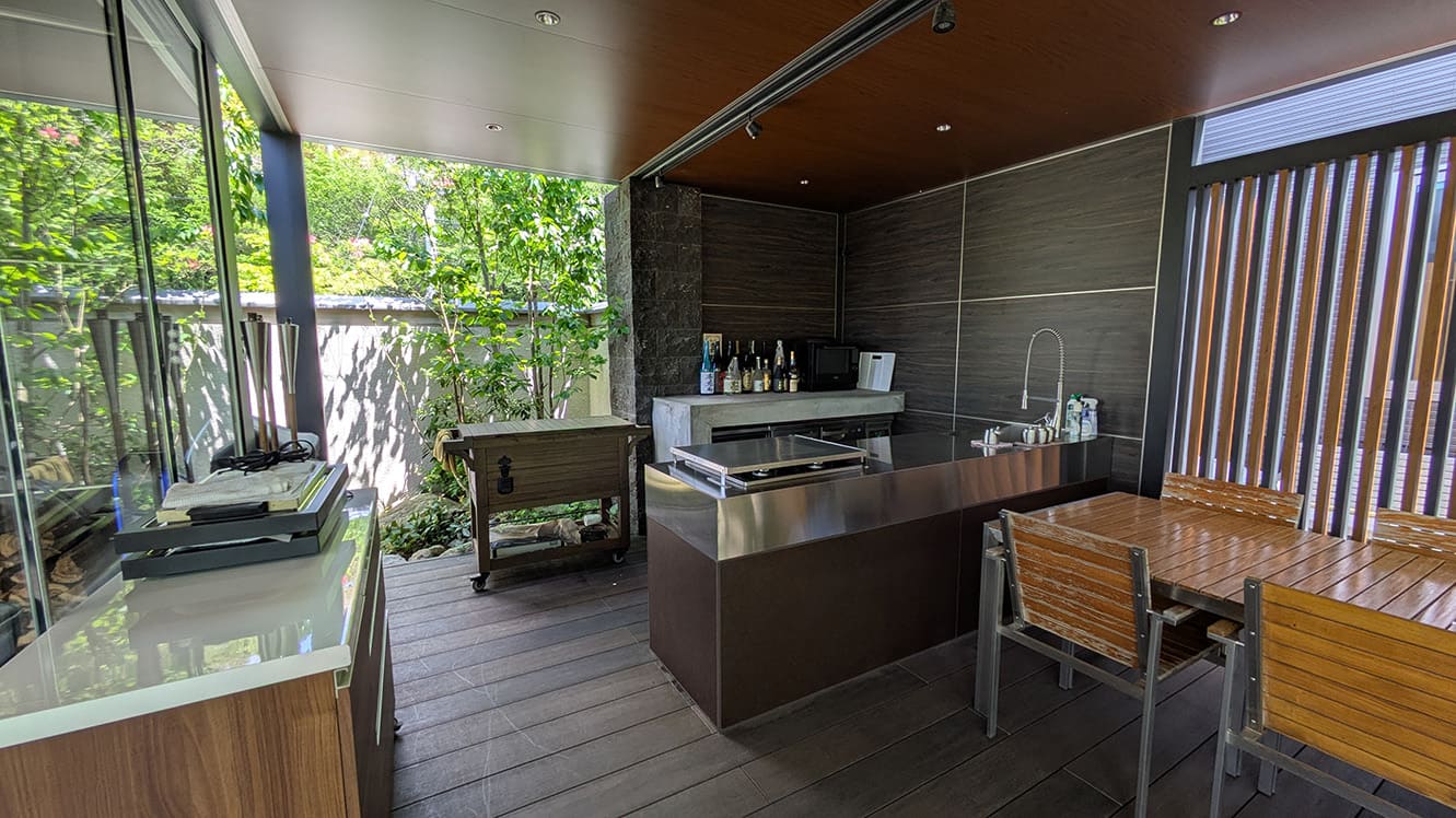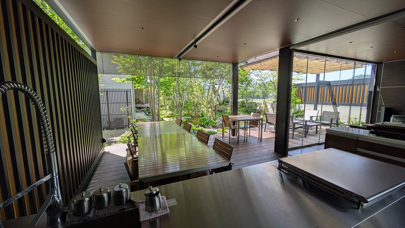 庭をみながら滝の水音を聞きながら、BBQや食事ができるスペースとして、