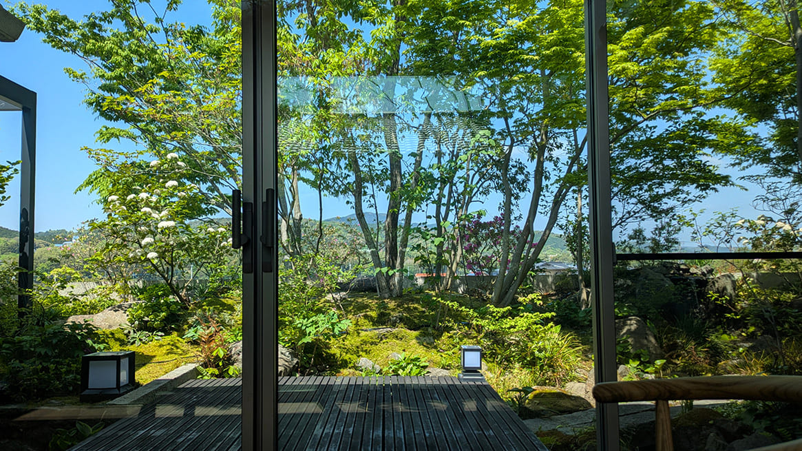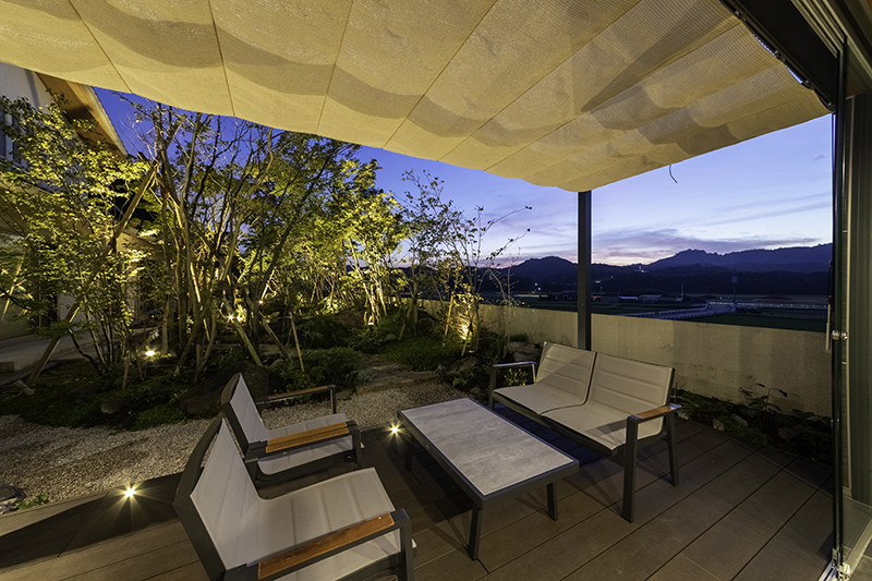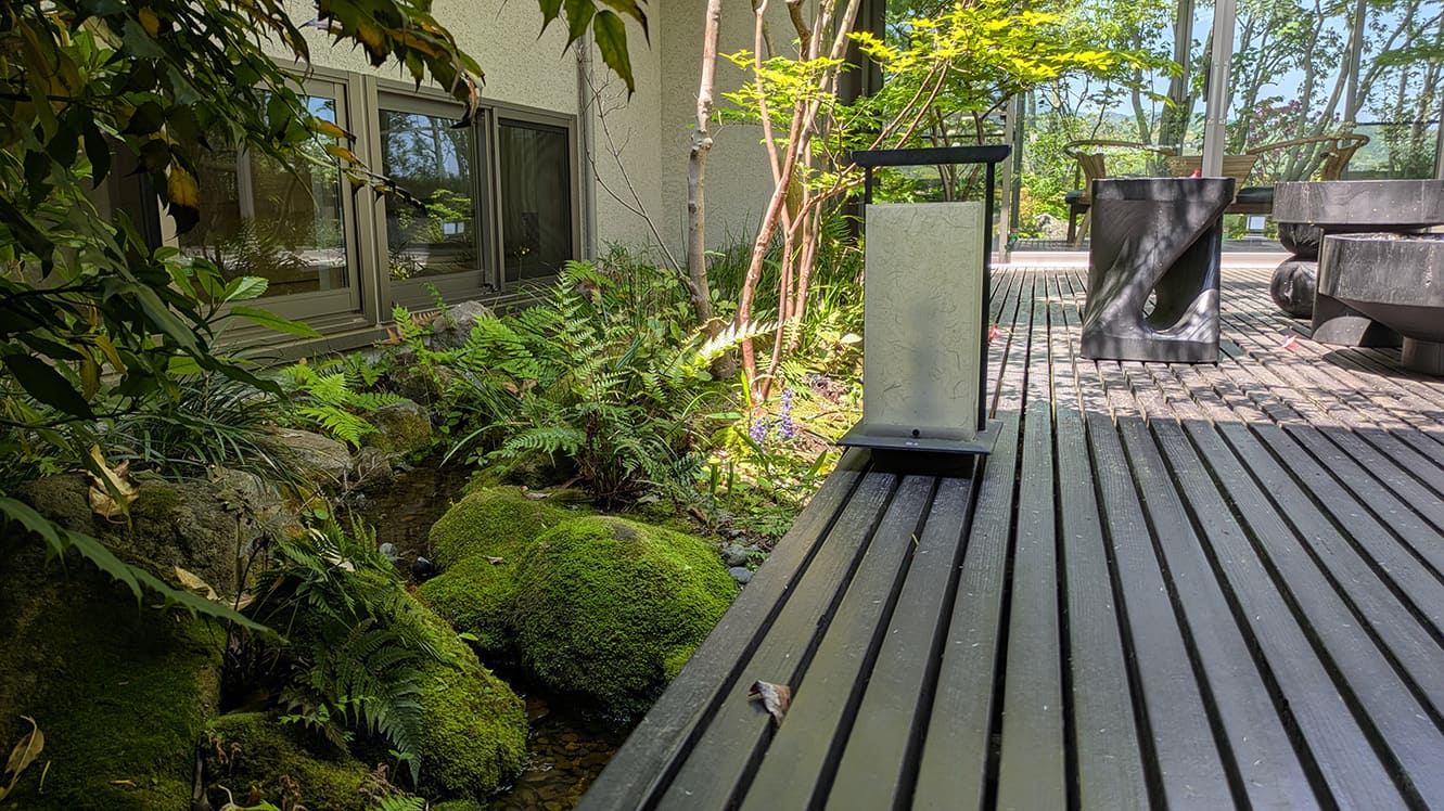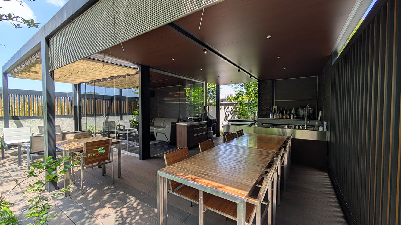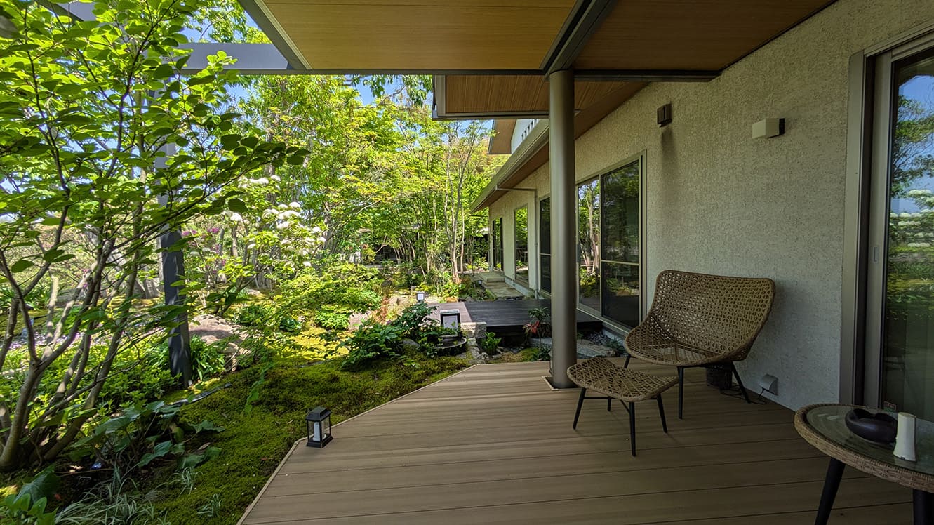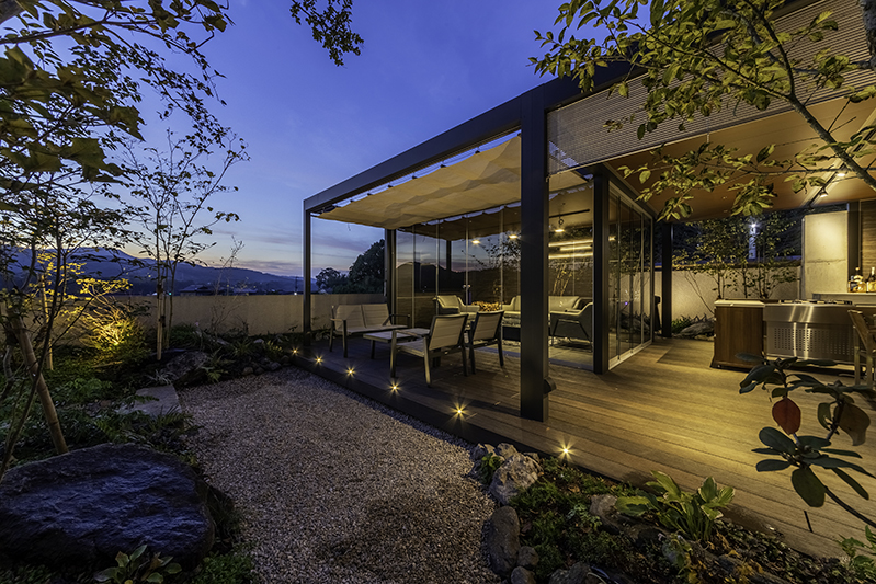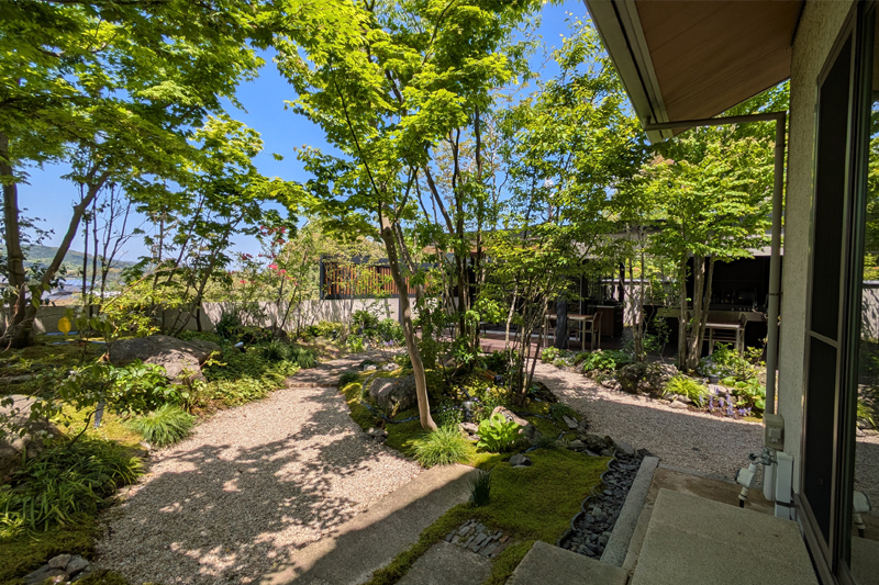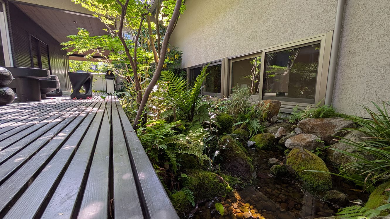 庭をみながら滝の水音を聞きながら、BBQや食事ができるスペースとして、