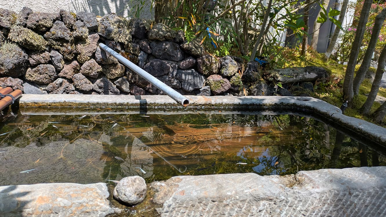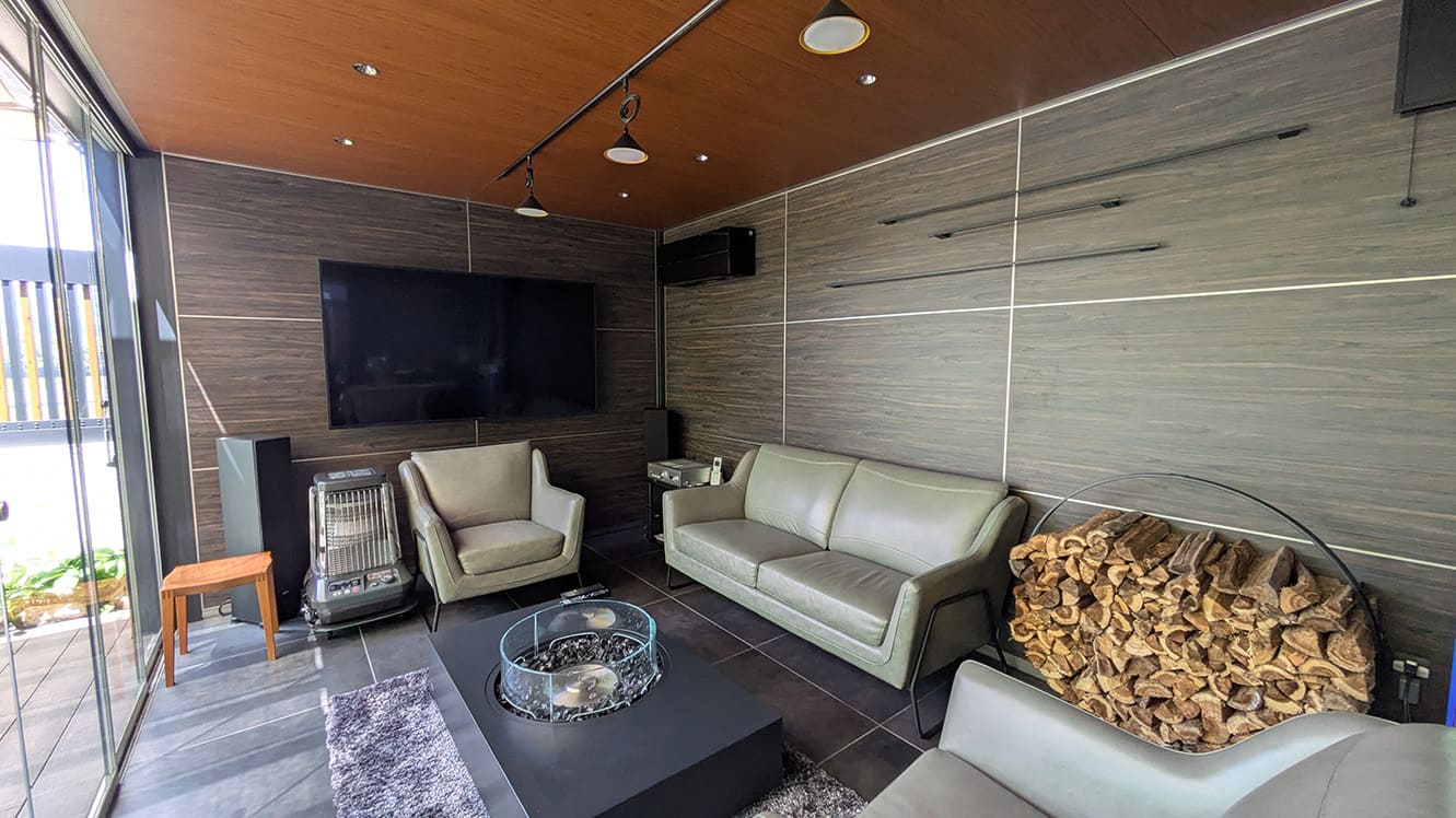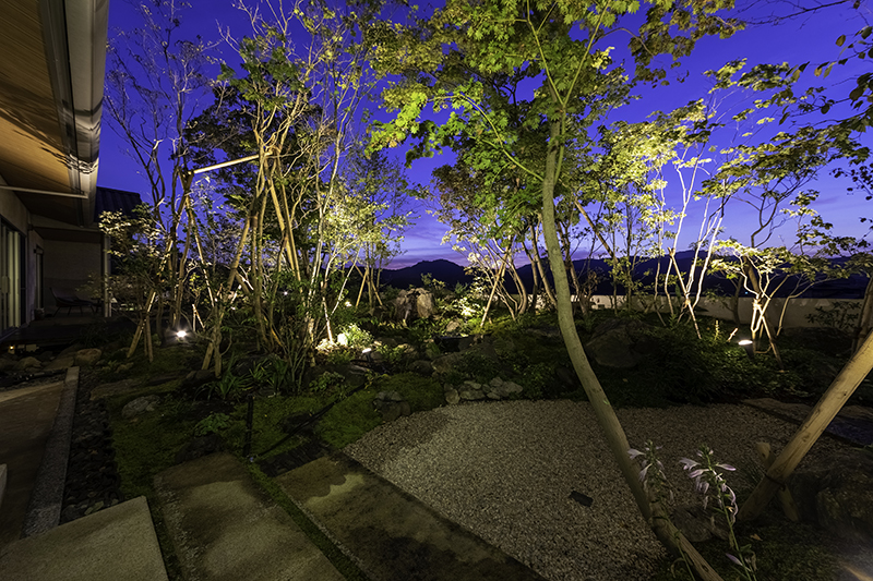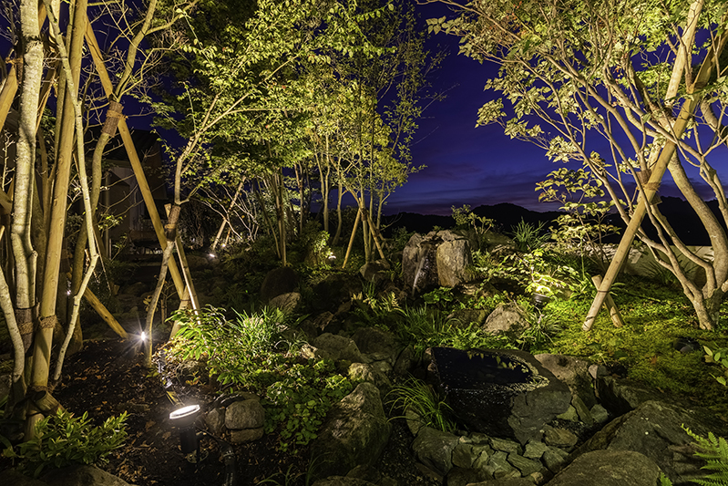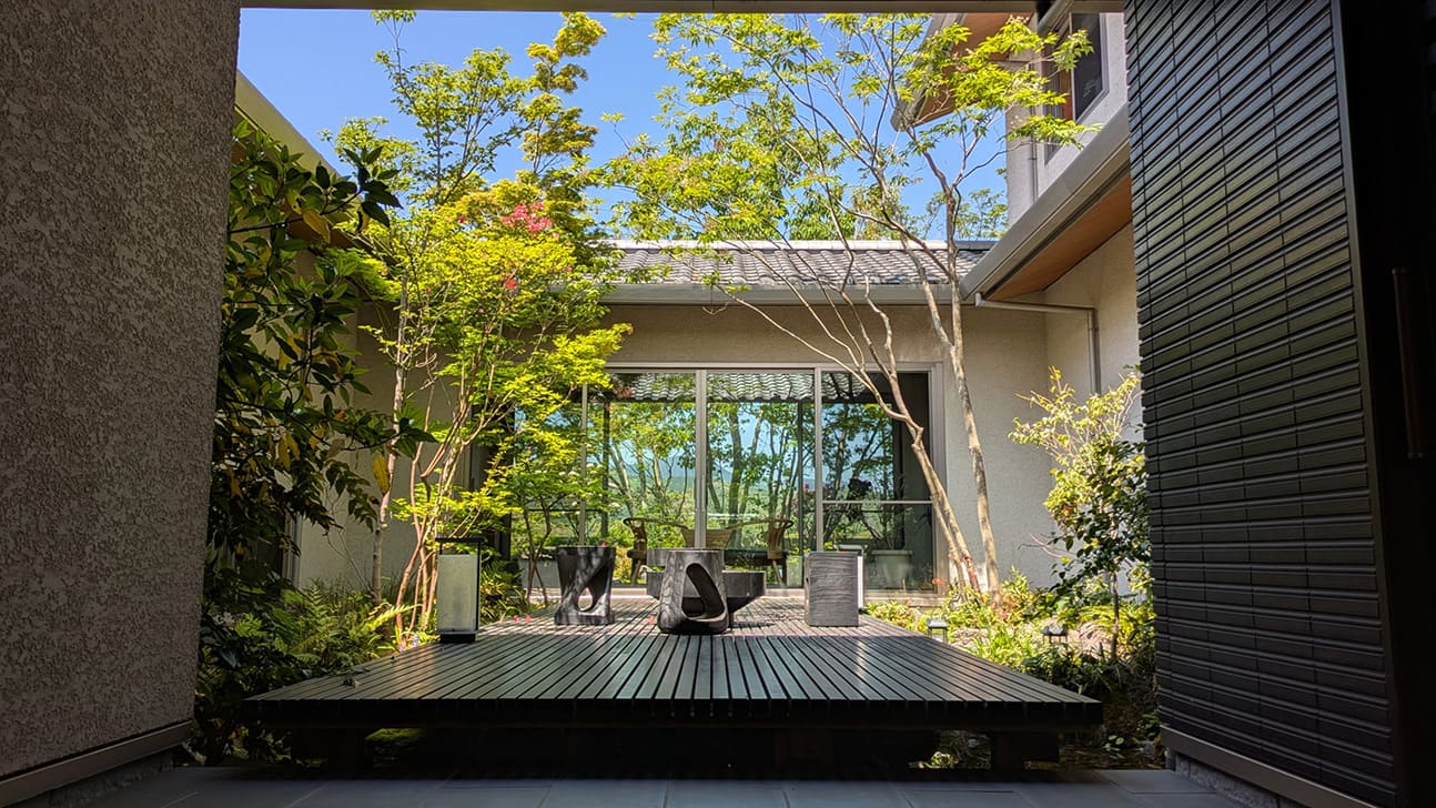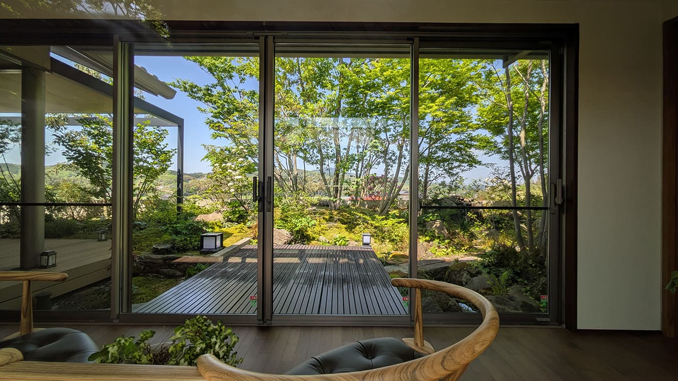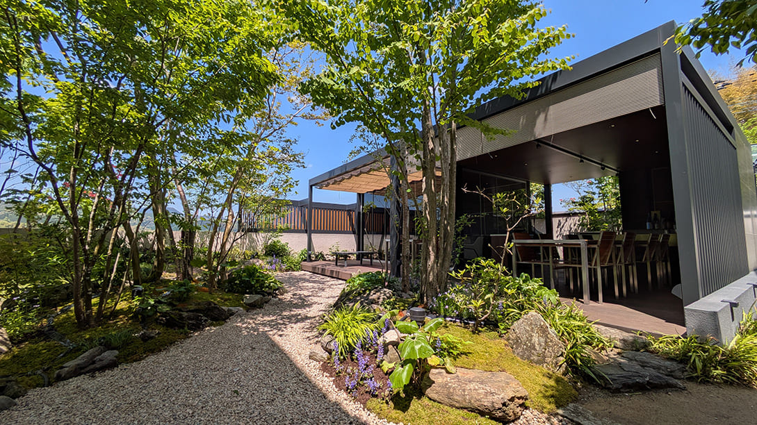 庭をみながら滝の水音を聞きながら、BBQや食事ができるスペースとして、