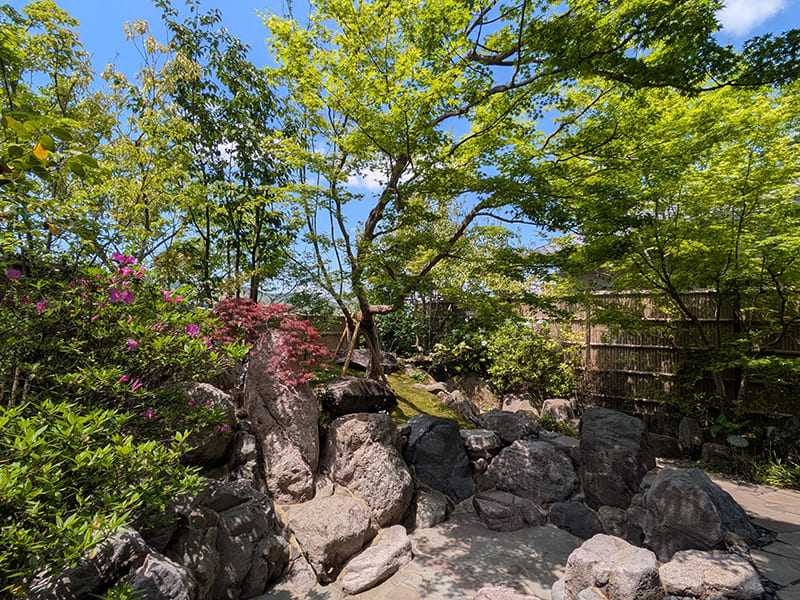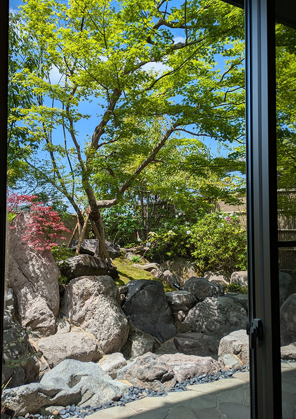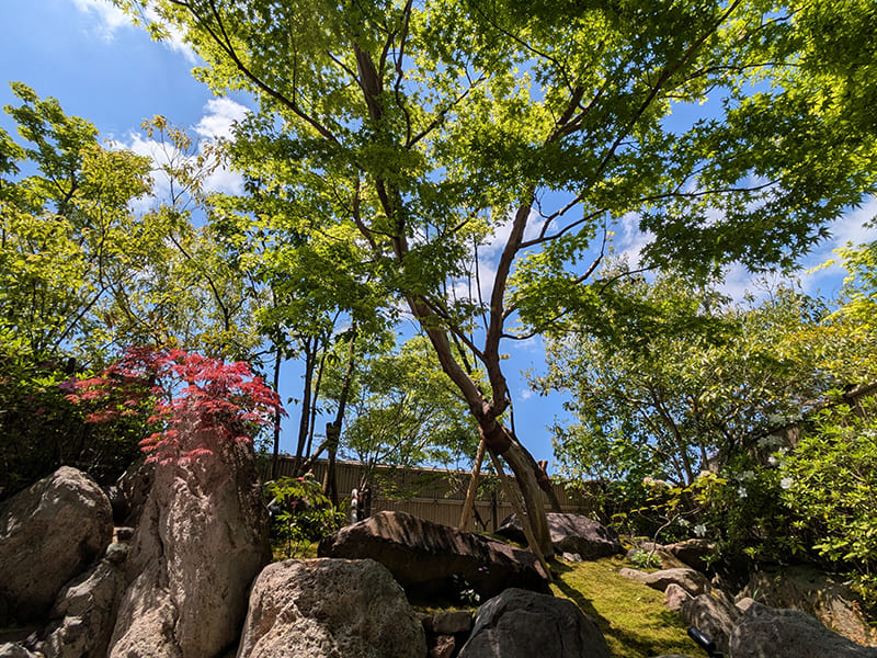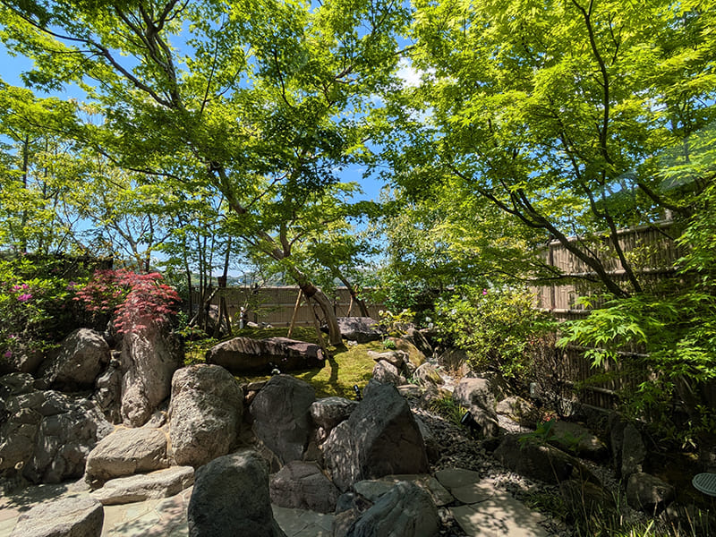 大浴場に面した大きな窓の前に、モミジ、苔、石で露天風呂を創りました。 露天風呂につかり、空を見上げれば、頭上に大きく被ってきたモミジの枝葉。 季節や時間によって見え方がかわる様は、のぼせる位いつまでも入ってられる気持ちよさ。 風でなびいて葉を落とせば、モミジシャワーもまた一興。