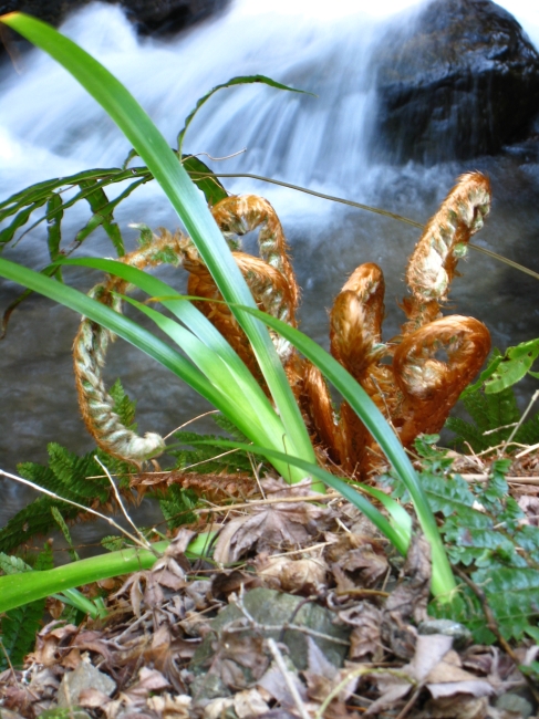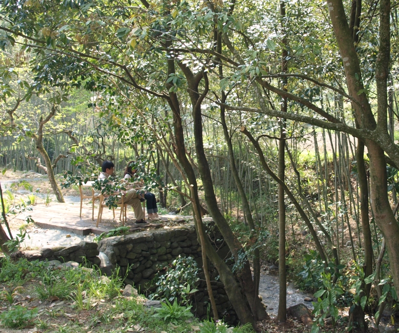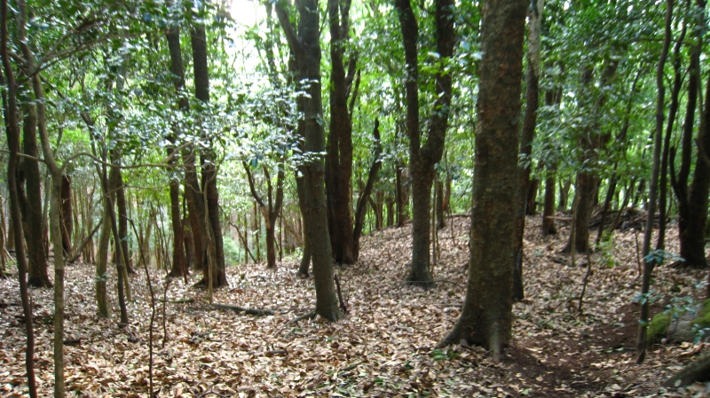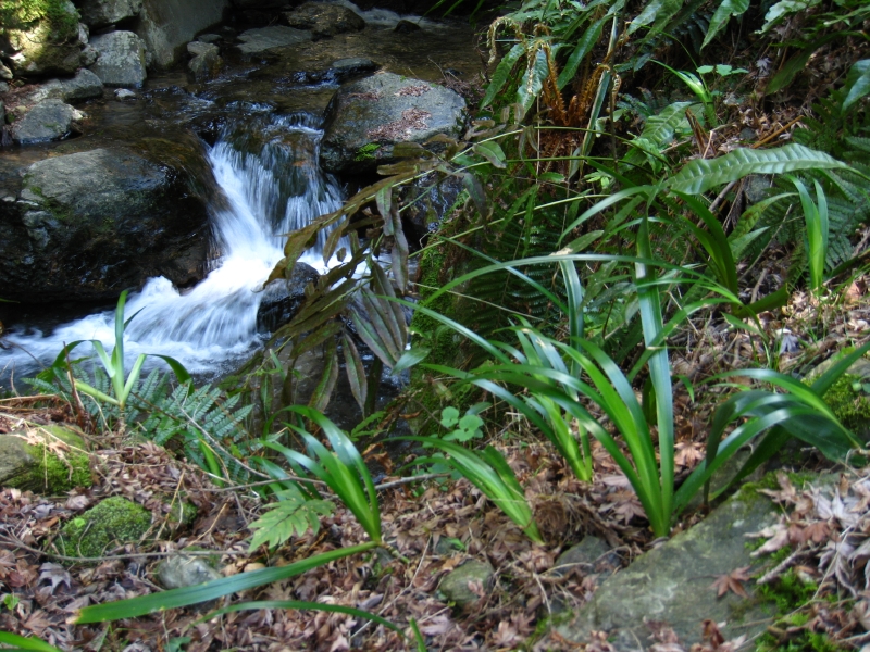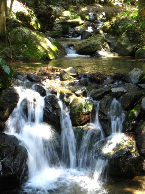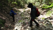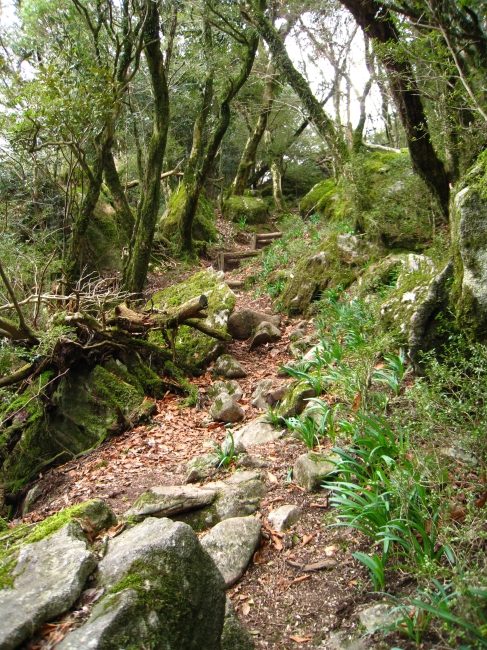 沢沿いに気持ちよく歩ける道が続き、頂上に近づくとツゲの原生林が現れます。