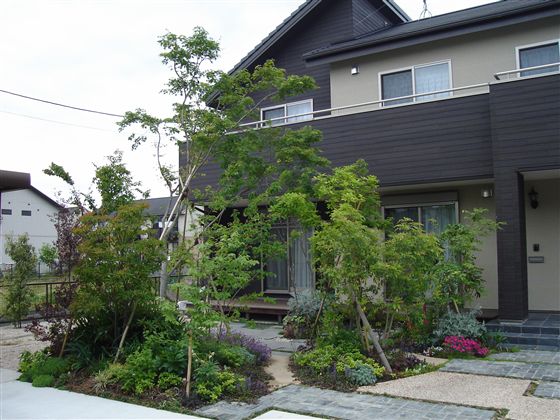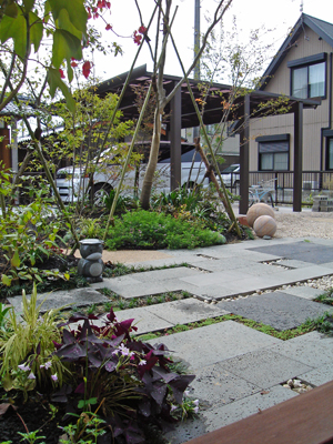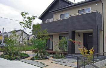駐車スペースと車の動線に、敷地の多くを費やしましたが、緑豊かな景色作りにも尽力しました。