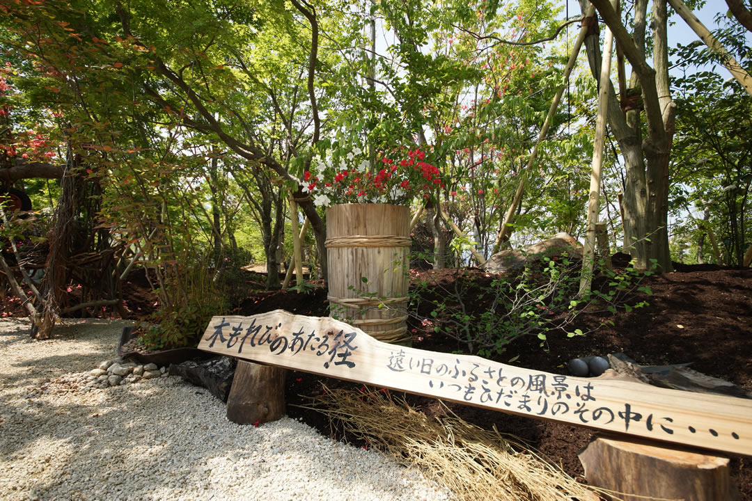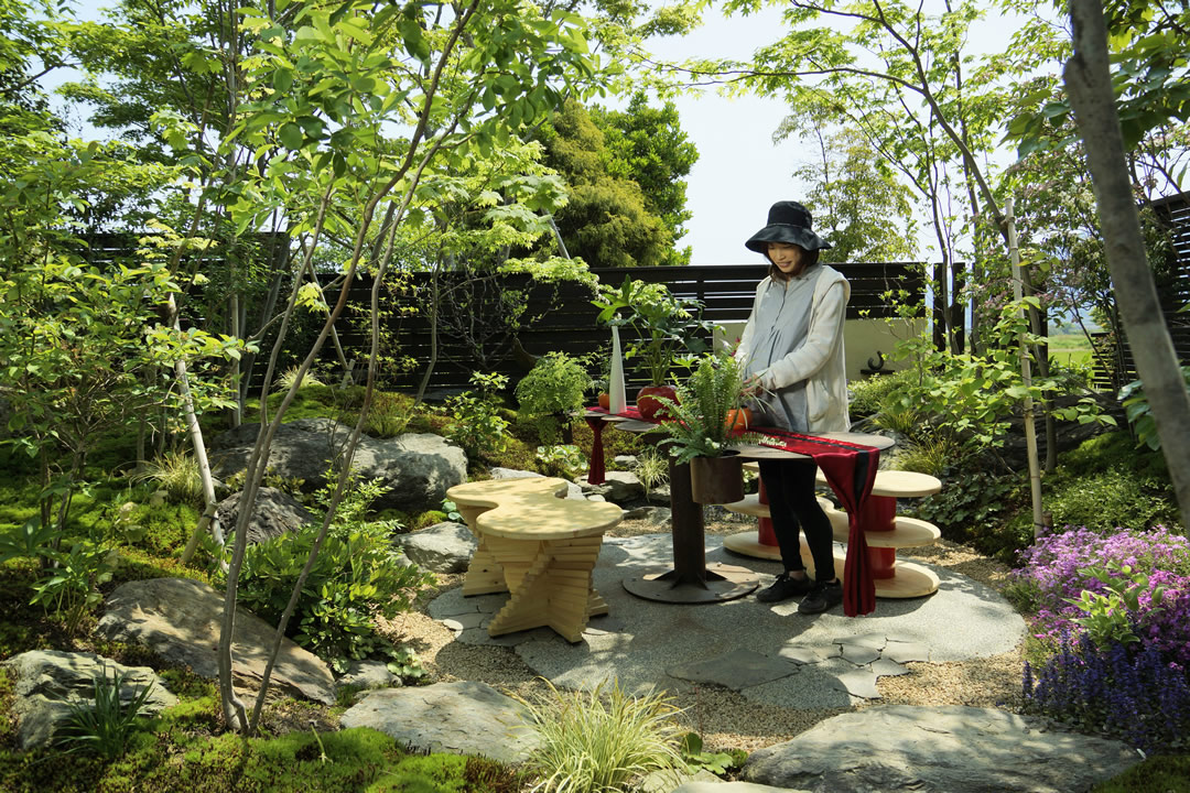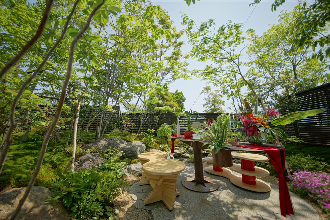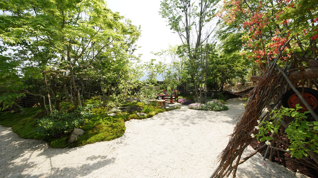 モデル庭園では、山取りの雑木と野の花、オリジナルのテーブルや清らかな水辺など、モダンで自然度の高い空間を創出しています。